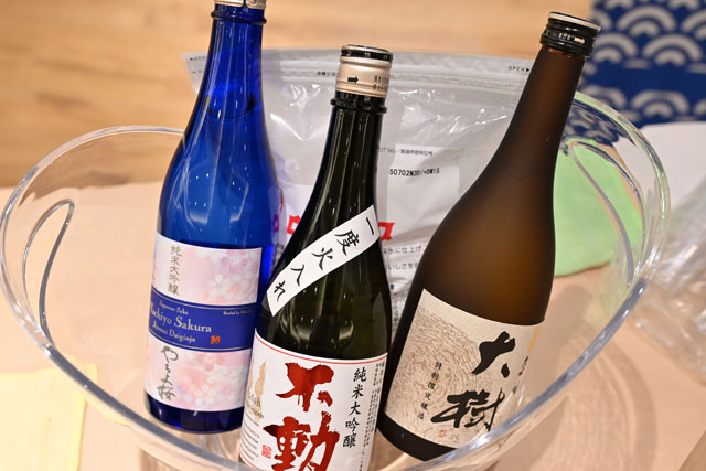 成田空港第1ターミナル中央ビル本館に開業した「NARITA BEYOND」に並べられた日本酒=25年8月1日 PHOTO: Tadayuki YOSHIKAWA/Aviation Wire