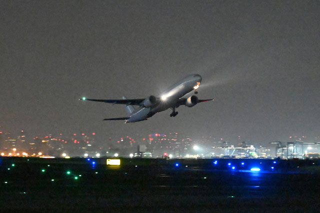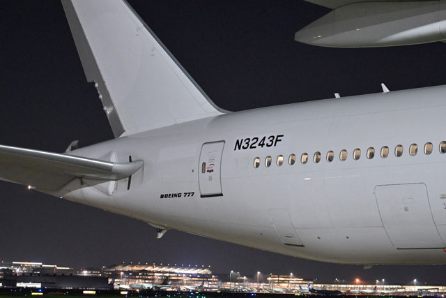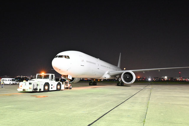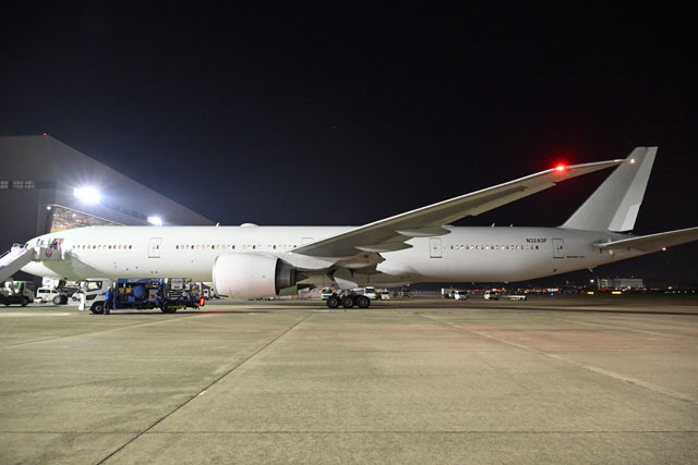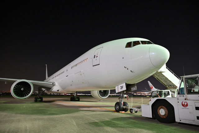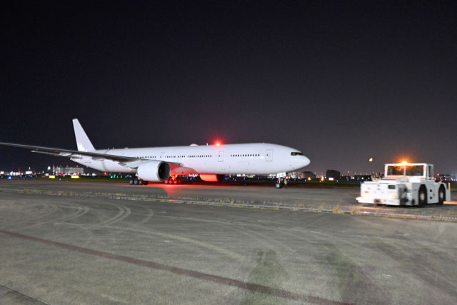 日本航空(JAL/JL、9201)が導入したボーイング777-300ER型機の初号機(MSN32431、LN429、登録記号N3243F、元JA731J)が8月4日夜、社員に見送られて羽田空港を出発し、日付が変わった5日午前0時すぎにC滑走路(RWY16L)から離陸して日本を離れた。JALでは今年の5月27日まで約21年にわたり運航され、売却先のパイロットの操縦で経由地のホノルルへ向かった。JALの退役機では一般的な鶴丸ロゴなどJAL塗装はすでに落とされた「白塗り」の状態で飛び立った。