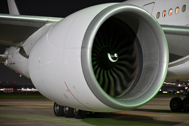 エンジンはGE製GE90-115Bを2基搭載。4発機だった747-400と比べ、燃料効率が約20%向上した。1発ずつスタートさせた直後は爆音を轟かせるものの、すぐに静かになるエンジン音は、同じGE90でも推力が異なる777-200ERとは異なる特徴だ。