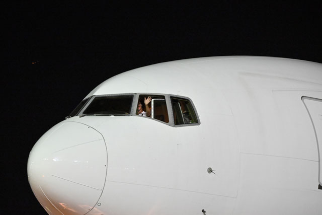 羽田空港を出発する元JAL 777-300ER JA731Jのコックピットから手を振るパイロット=25年8月4日 PHOTO: Tadayuki YOSHIKAWA/Aviation Wire