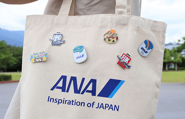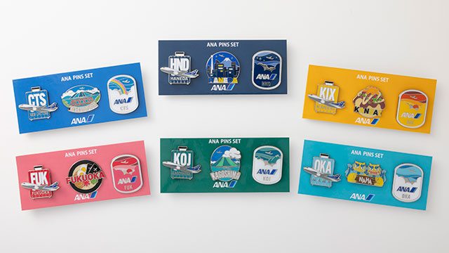 ANAが就航する国内6空港の3レターをモチーフにしたANAピンズセットの使用例(全日空商事提供)