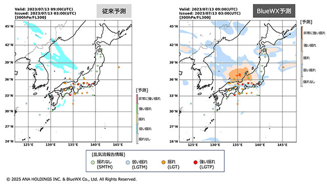 乱気流の従来予測とBlueBlueWX予測(ANA提供)