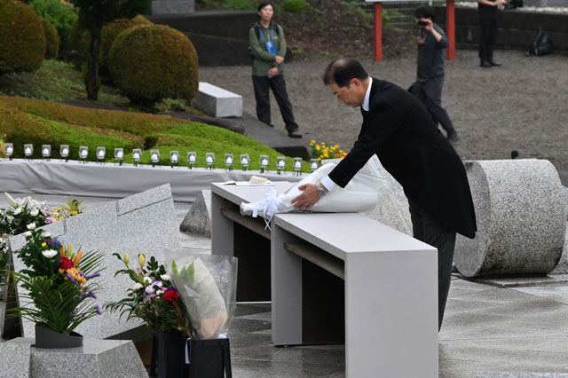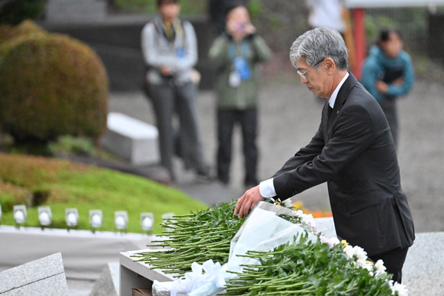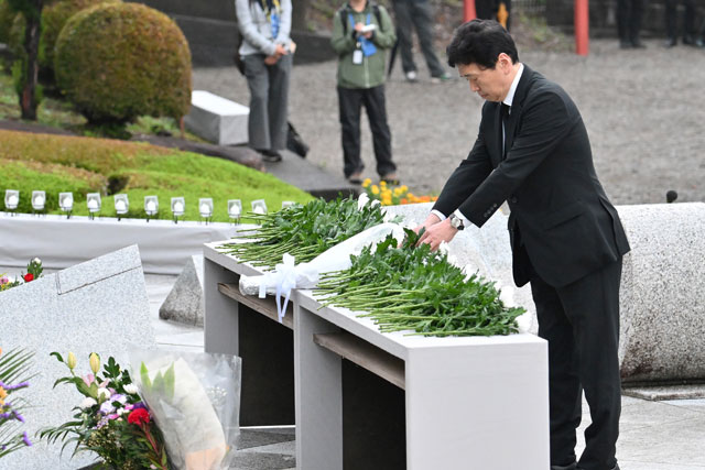 慰霊の園で献花する水嶋智国土交通事務次官=25年8月12日 PHOTO: Tadayuki YOSHIKAWA/Aviation Wire