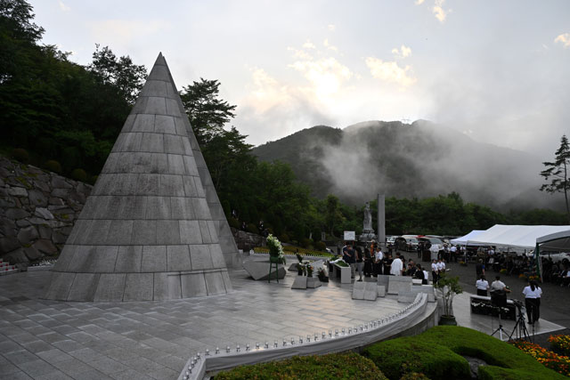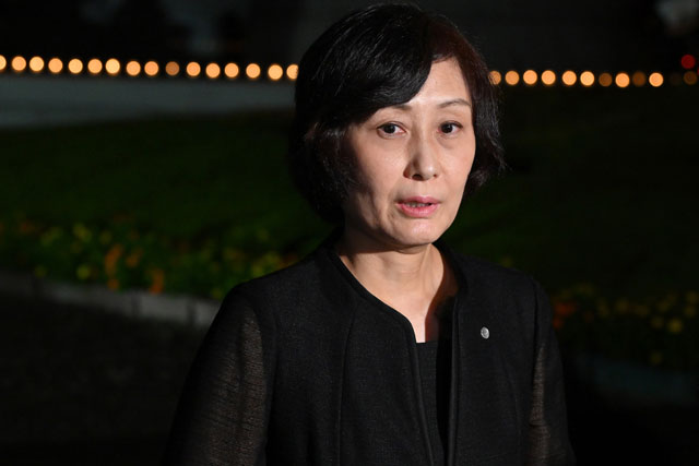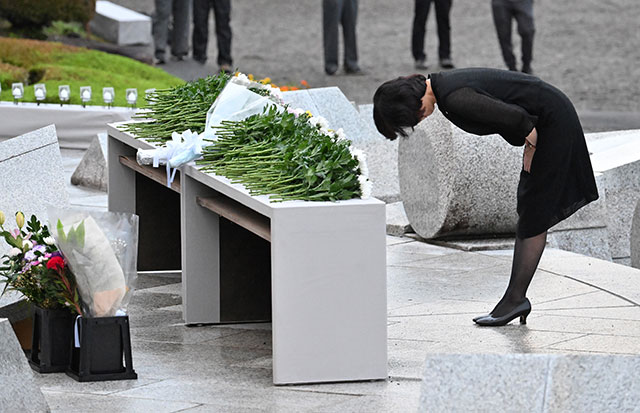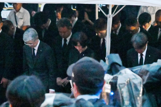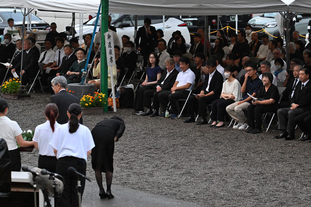 12日昼に時折雨が強まる中、御巣鷹山の山頂付近にある「昇魂之碑」を訪れ、慰霊の園で開かれた慰霊式では深々と頭を下げて献花した。