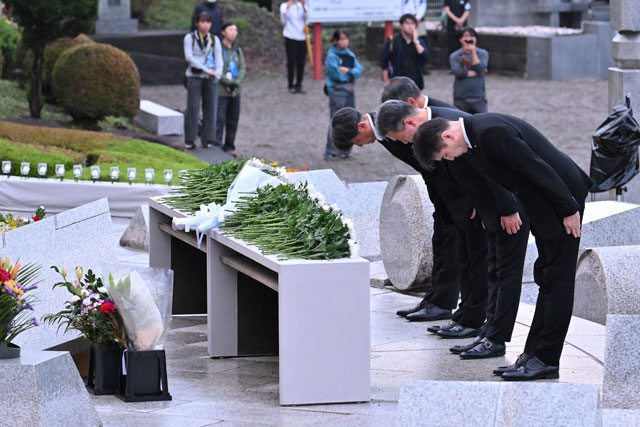 慰霊の園で遺族に一礼するJALの鳥取社長=25年8月12日 PHOTO: Tadayuki YOSHIKAWA/Aviation Wire