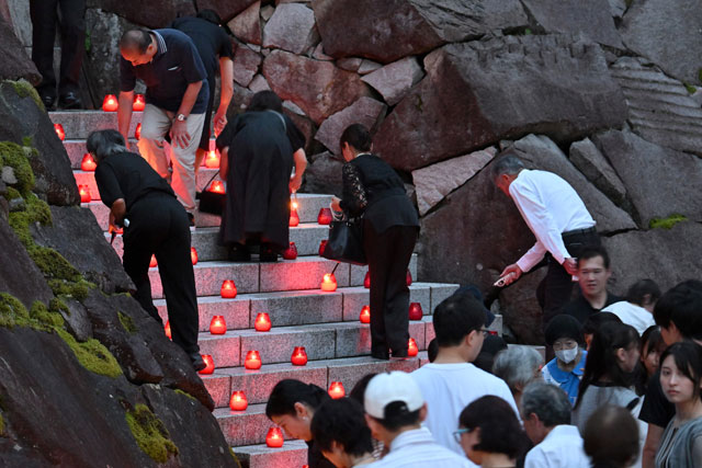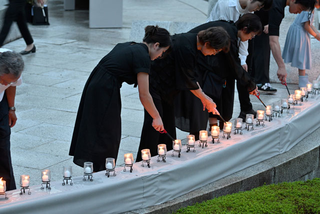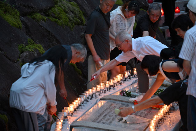 慰霊の園でろうそくをともす遺族=25年8月12日 PHOTO: Tadayuki YOSHIKAWA/Aviation Wire