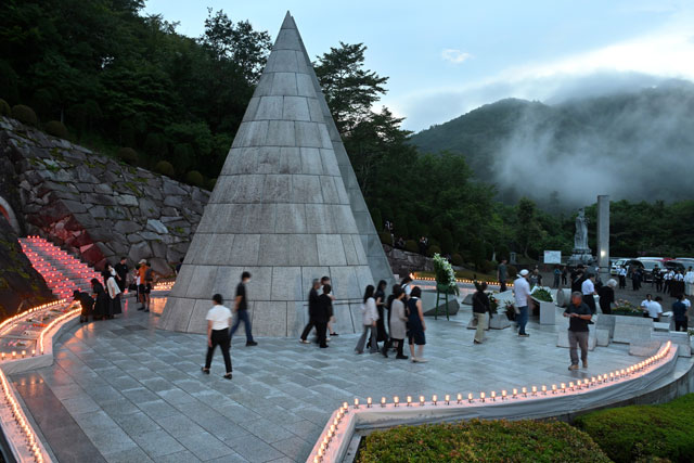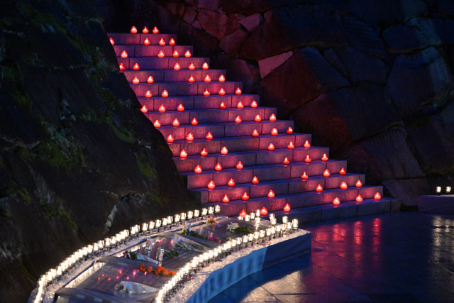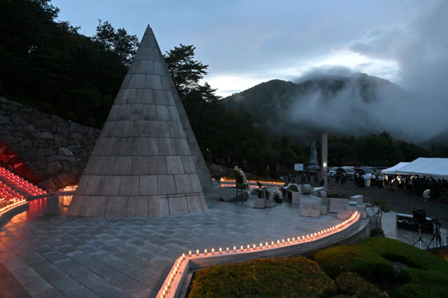 JL123便墜落時刻の午後6時56分に参列者が黙とうを捧げ犠牲者数と同じ520本のろうそくがともされた慰霊の園=25年8月12日午後6時56分 PHOTO: Tadayuki YOSHIKAWA/Aviation Wire
