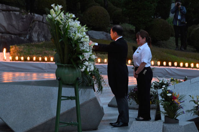慰霊の園で最後のろうそくをともす黒澤理事長=25年8月12日 PHOTO: Tadayuki YOSHIKAWA/Aviation Wire