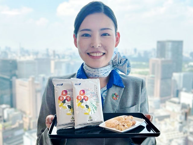 ANAが9月から上級クラスで提供する「いろどりおかき」を手にする客室乗務員(同社提供)