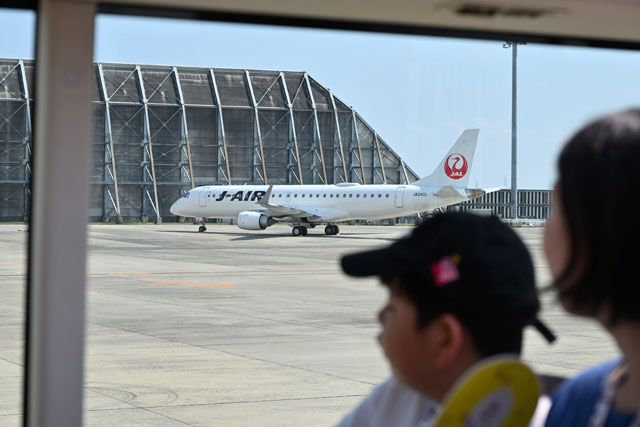 伊丹空港の制限区域を走る「JAL×ガンダム レストランバス」から見た駐機中のジェイエアE190=25年8月30日 PHOTO: Tadayuki YOSHIKAWA/Aviation Wire