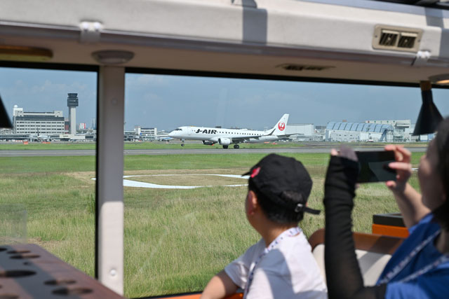 伊丹空港の制限区域を走る「JAL×ガンダム レストランバス」から離陸するジェイエアのE190を見る参加者=25年8月30日 PHOTO: Tadayuki YOSHIKAWA/Aviation Wire
