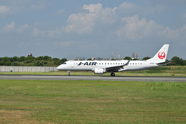伊丹空港の制限区域を走る「JAL×ガンダム レストランバス」から見るジェイエアのE190=25年8月30日 PHOTO: Tadayuki YOSHIKAWA/Aviation Wire