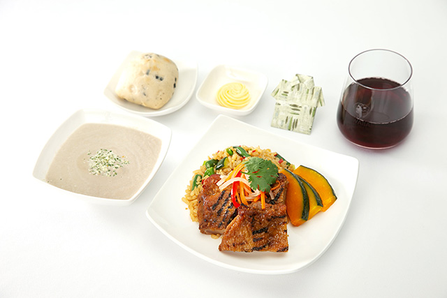 日本(羽田・関西・福岡)発はレモングラスチキンをメインとし、ローストカボチャとベジタブルチャーハン、マッシュルームのクリームスープ、パンを添える。デザートにはチョコレートムースとハウピアのケーキを用意する。