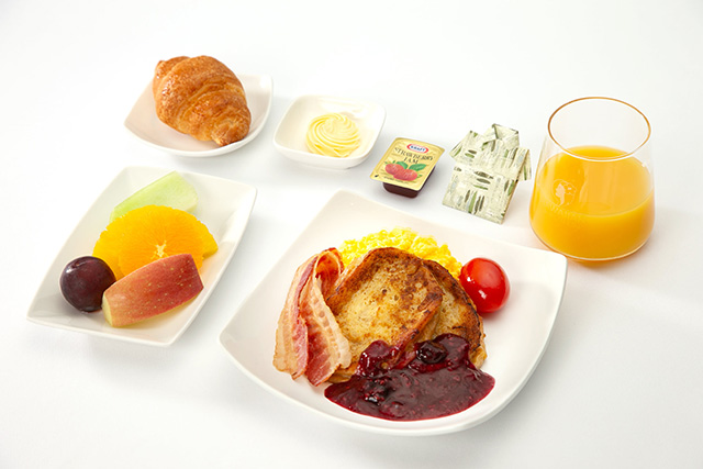 このほかビジネスクラスでは和食も用意。ホノルル発は鶏の梅しそ巻き、日本発はブリのバター照焼きを、それぞれ台の物として提供する。