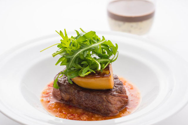 国際線ファーストクラスのメニュー「牛ヒレ肉とフォアグラのステーキ ラディッシュと柑橘のソース 黒トリュフとジャガイモのピューレ」(JAL提供)