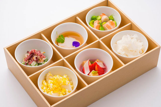 国際線ファーストクラスのメニュー「オードブル6種盛り」(JAL提供)