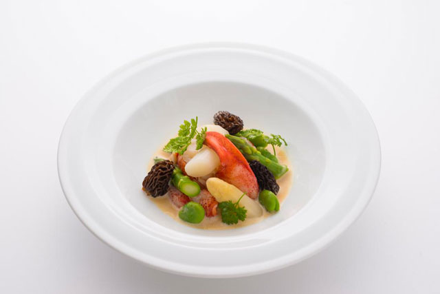 ビジネスクラスのメニュー「オマールとアスパラとモリーユのヴァンジョーヌソース」(JAL提供)
