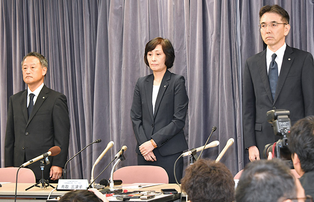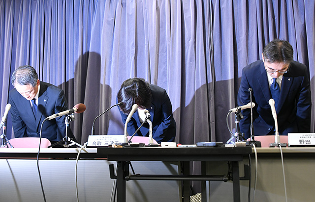 国交省での会見で陳謝する(左から)JALの中川常務、鳥取社長、野田常務=25年9月10日 PHOTO: Yusuke KOHASE/Aviation Wire