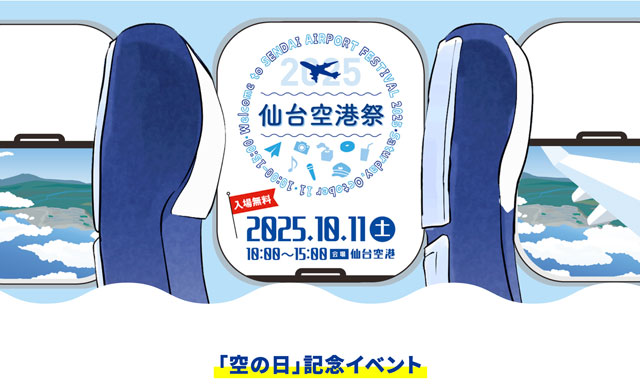 仙台空港で「仙台空港祭2025」が10月11日に開かれる。「空の日」にあわせて毎年実施している催しで、今年は空港や飛行機を身近に感じられる企画を用意し、ステージイベントの一部は4日に先行開催する。