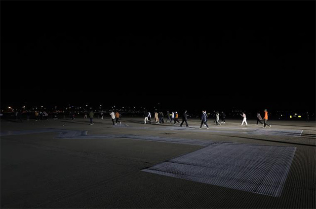 中部空港の滑走路を歩くツアー参加者(同社資料から)
