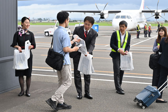 札幌丘珠空港で出発を待つ知床国立公園の周年記念ロゴを貼ったHACのATR42 2号機初便の乗客に記念品を手渡す武村栄治社長ら=25年9月18日 PHOTO: Tadayuki YOSHIKAWA/Aviation Wire