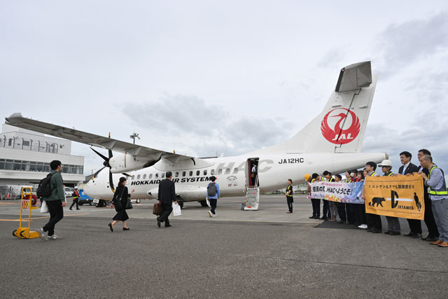 知床国立公園の周年記念ロゴを貼ったHACのATR42 2号機初便に搭乗する乗客=25年9月18日 PHOTO: Tadayuki YOSHIKAWA/Aviation Wire