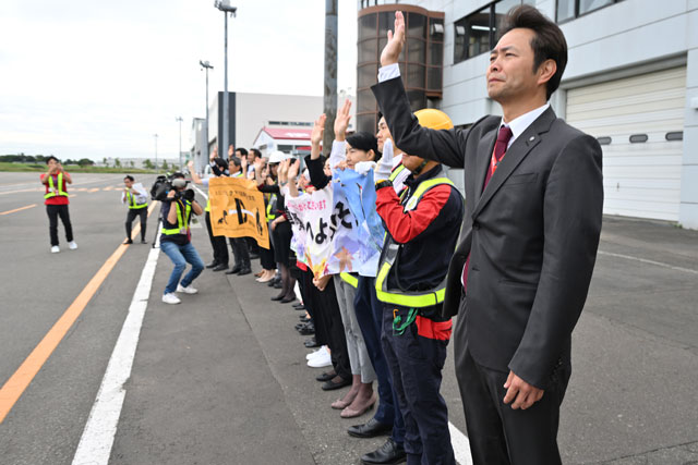 知床国立公園の周年記念ロゴを貼ったHACのATR42 2号機初便を見送る武村栄治社長ら=25年9月18日 PHOTO: Tadayuki YOSHIKAWA/Aviation Wire