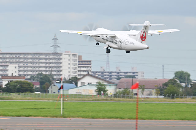 札幌丘珠空港を離陸する知床国立公園の周年記念ロゴを貼ったHACのATR42 2号機初便=25年9月18日 PHOTO: Tadayuki YOSHIKAWA/Aviation Wire