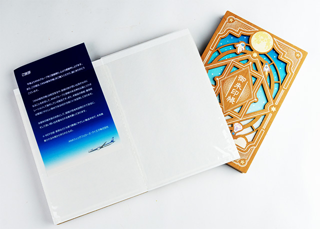 御朱印帳の大きさはタテ180ミリ、ヨコ120ミリ。御朱印20枚を収納できるクリアポケット仕様で仕上げた。航空神社での販売価格は税込み3500円。ANAグループの通販サイト「ANA Mall(ANAモール)」の「ANAワクワクショップ」では、税・送料込み4400円で販売する。航空神社では通常のジャバラ奉書紙仕様も取り扱う。