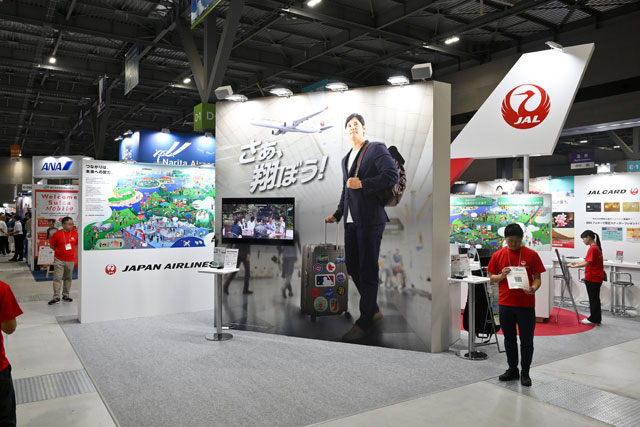 日本航空(JAL/JL、9201)のブースはD-094。2024年1月に就航した国際線の新フラッグシップであるエアバスA350-1000型機のJAL初となる個室型ビジネスクラスのシート体験コーナーを設けた。2018年からサポートしている米メジャーリーグ(MLB)ロサンゼルス・ドジャースに所属する大谷翔平選手が大きく描かれている。