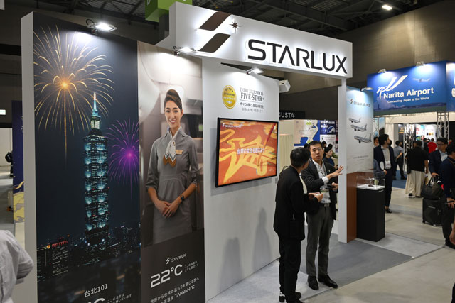台湾のスターラックス航空(星宇航空、SJX/JX)のブースはD-079。日本の12空港と台北や台中を結ぶ路線網や台湾旅行をPRしている。