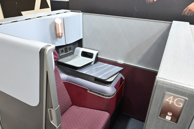 愛知県で開かれているツーリズムEXPOのJALブースに展示されたA350-1000ビジネスクラスのシート=25年9月25日 PHOTO: Tadayuki YOSHIKAWA/Aviation Wire