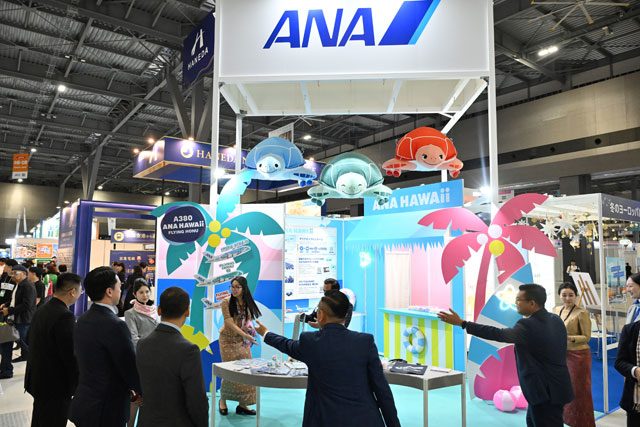 全日本空輸(ANA/NH)のブースはD-078。A380「FLYING HONU(フライング・ホヌ)」で運航している成田-ホノルル線をはじめとするハワイ旅行の紹介や、国際線の新規就航地であるミラノ・ストックホルム・イスタンブールを紹介している。