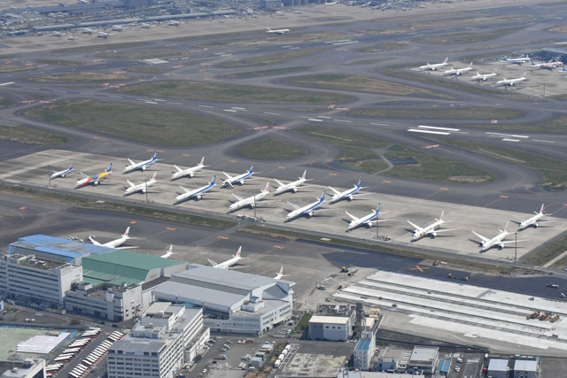 ・【空撮】緊急事態宣言後の羽田空港、ANAとJAL大型機並ぶ 4月入り予約減(20年4月8日)