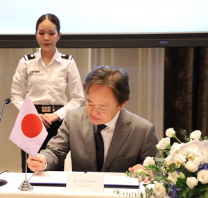 姉妹空港締結書に署名するCJIACの籠橋社長(同社提供)