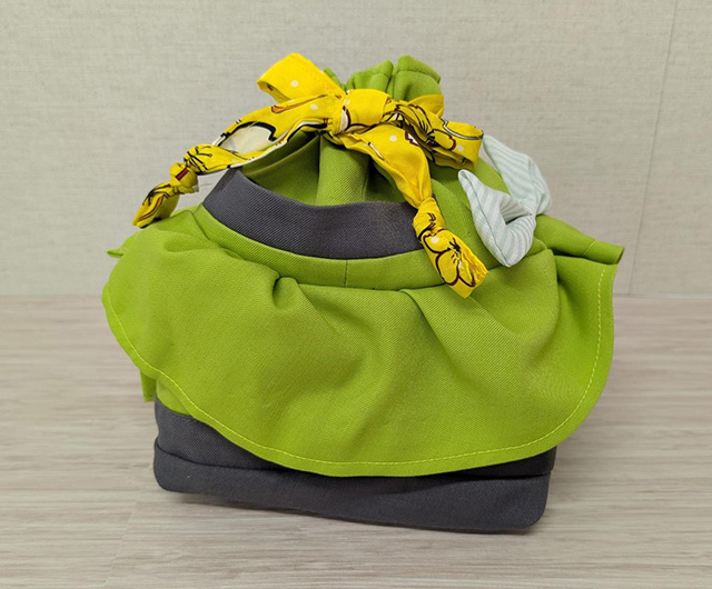 販売するのはミニポーチ、巾着、シュシュ、手提げバッグの4種類。巾着のひもにはスカーフを活用し、ジャケットのポケットを収納に活かした。シュシュはスカーフから製作し、手提げバッグはリバーシブルなデザインに仕上げた。アップサイクル品の一部は、千葉・成田市内にある本社で開催する「公津フェスタ」で販売する。