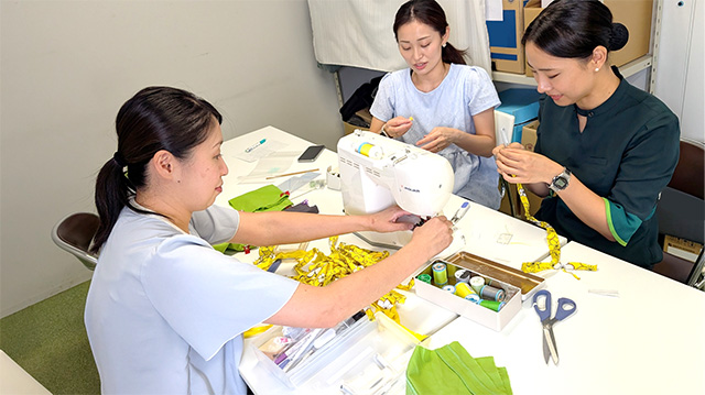 旧制服をアップサイクルし新商品を製作するスプリング・ジャパンの社員有志(同社提供)