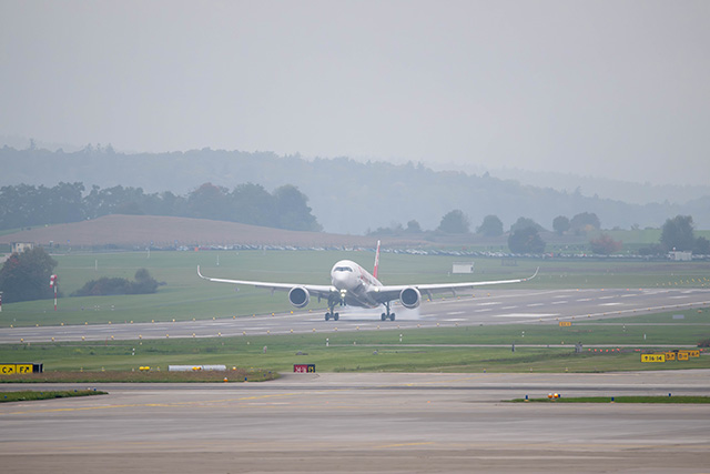 チューリッヒ空港に着陸したスイス インターナショナル エアラインズのA350-900初号機=PHOTO: Thomas Luethi, Swiss International Air Lines AG