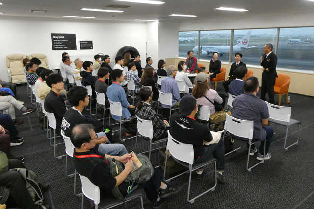 JALのJA735J ファイナル見学ツアーで開かれたパイロットらによるトークショー(同社提供)