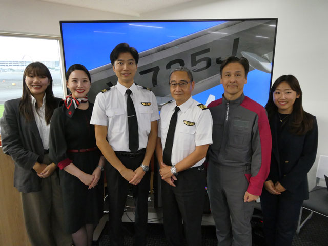 JALのJA735J ファイナル見学ツアーで開かれたトークショー登壇者と企画担当者(同社提供)