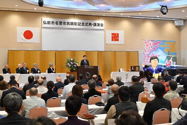 式典後の講演で、藤野氏は「子供のころに見上げた岩木山の雄大な姿、春になると満開になる弘前公園の桜は私の原点」と振り返った。
