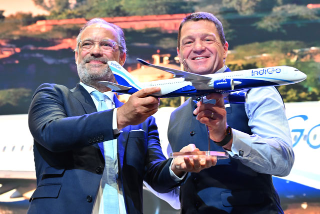 A350-900を30機追加発注したインディゴのピーター・エルバースCEO(右)=25年6月1日 PHOTO: Tadayuki YOSHIKAWA/Aviation Wire
