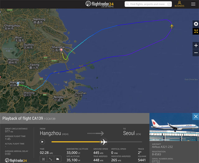 中国国際航空の杭州発ソウル仁川行きCA139便の位置情報(Flightradar24から。実際の位置とは誤差がある場合があります)