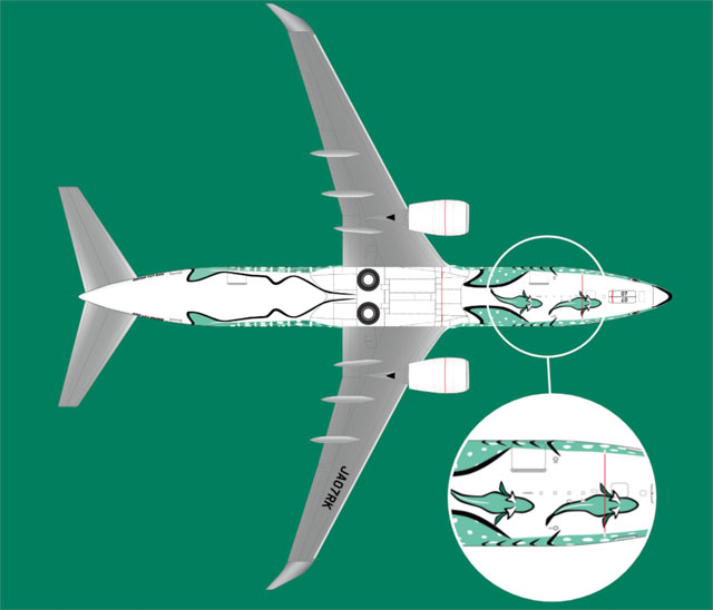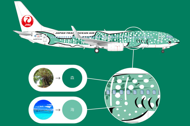 機体デザインは、エメラルドグリーンを基調とし、世界自然遺産に登録されている「やんばると西表の森」や沖縄の海をイメージ。自然の循環をテーマに、海と山のつながりを表現している。機体に大きく描かれたジンベエザメの中には、 沖縄固有の動植物としてコノハチョウやヤンバルクイナ、ノグチゲラ、イジュ、イリオモテヤマネコ、ヤンバルテナガコガネ、オキナワイシカワガエルがデザインされ、多様な生態系とその保全の重要性を伝える。
