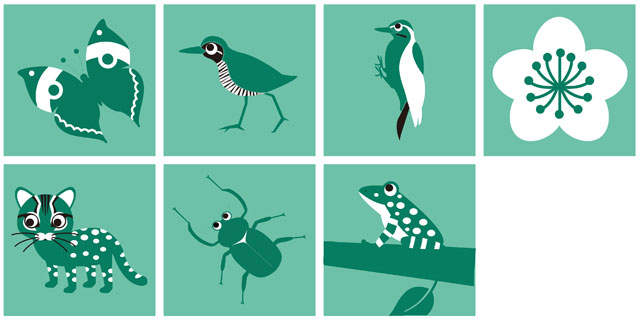 JTAの特別塗装機「結ジンベエ」は大きく描かれたジンベエザメの中に(左上段から右下段へ)コノハチョウやヤンバルクイナ、ノグチゲラ、イジュ、イリオモテヤマネコ、ヤンバルテナガコガネ、オキナワイシカワガエルがあしらわれる(同社提供)