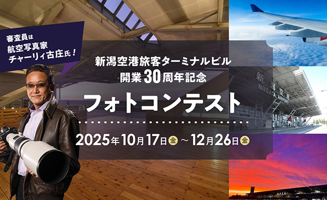 新潟空港のターミナルを運営する新潟空港ビルディングは、現在のターミナルの開業30周年を記念するフォトコンテストを10月17日に始めた。新潟空港の魅力を表現した写真をプロ・アマ問わず募集する。募集期間は12月26日まで。
