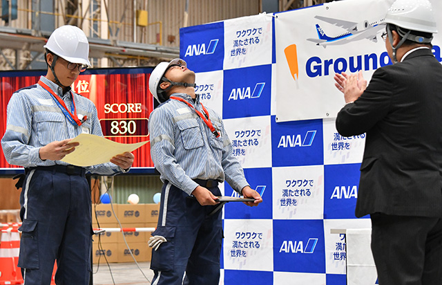 全日本空輸(ANA/NH)グループは10月28日、空港で貨物・手荷物の搬送や航空機への搭降載を担当するグランドハンドリングスタッフ(グラハン)の技量を競う「ANAグループグランドハンドリングスキルコンテスト」を伊丹空港のANA格納庫で開いた。今回が2回目となる全国規模でのスキルコンテストで、従来はエリアや会社単位で実施していたが、2024年からは規模を拡大しANAグループ全体のスキル底上げを狙う。第2回の決勝には10空港13社のグラハンが2人1組で出場し、鹿児島空港の宮原知也さん(入社7年目)と青山祐也さん(同6年目)のペアが初優勝した。