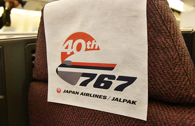 JALの767就航40周年記念のヘッドレストカバー=25年10月31日 PHOTO: Yusuke KOHASE/Aviation Wire