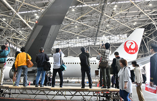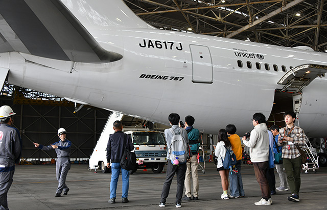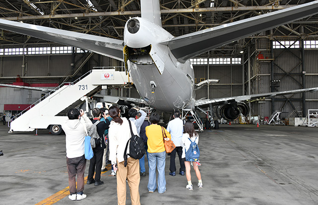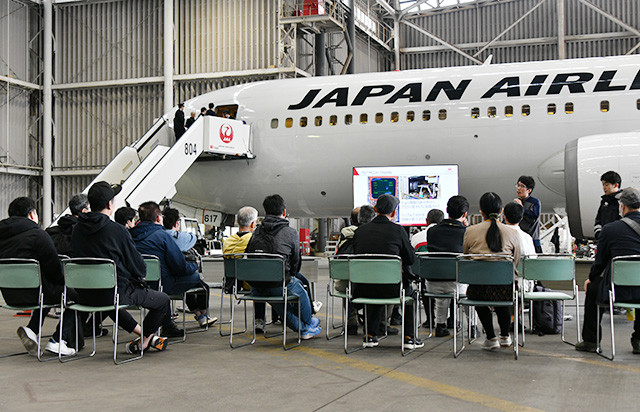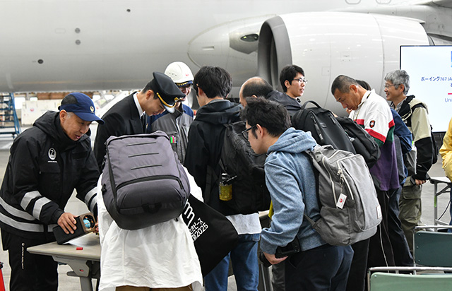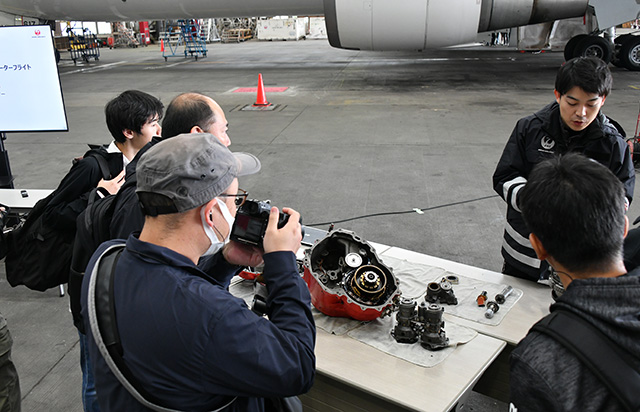 格納庫では、翌日の記念チャーターに投入する767-300ER(登録記号JA617J)を見学。コックピットへの着座体験のほか、機体周りをくまなく見学した。参加者はコックピットでの記念撮影や、機体細部の撮影などを楽しんだ様子だった。このほか、767に搭載する部品を展示し、講師役に熱心に質問する姿も多くみられた。