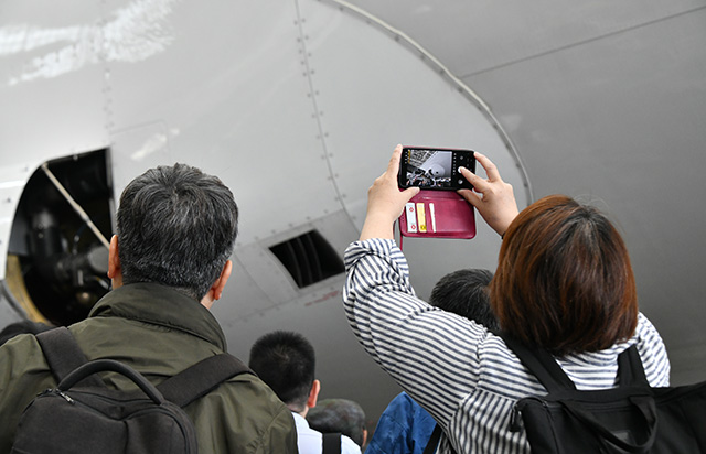 機体との記念撮影を楽しむJALの767就航40周年記念イベントの参加者=25年10月31日 PHOTO: Yusuke KOHASE/Aviation Wire